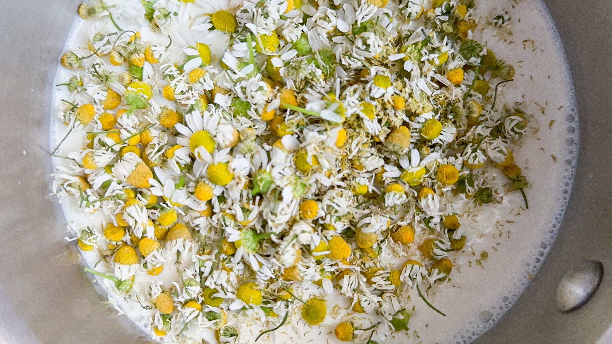Steep the milk. Place the chamomile flowers or tea bags and milk into a saucepan, and bring to a gentle simmer, when it just starts to bubble on the edges of the pan. Turn off the heat, cover the pot and let the chamomile steep for 6-8 minutes. Strain out the leaves or remove the tea bags, pressing gently to squeeze out any extra milk. Add additional milk to get to 480 g (2 cups) of liquid. (At this point, you can chill the steeped milk for up to a day if you don't want to make the pudding right away.)