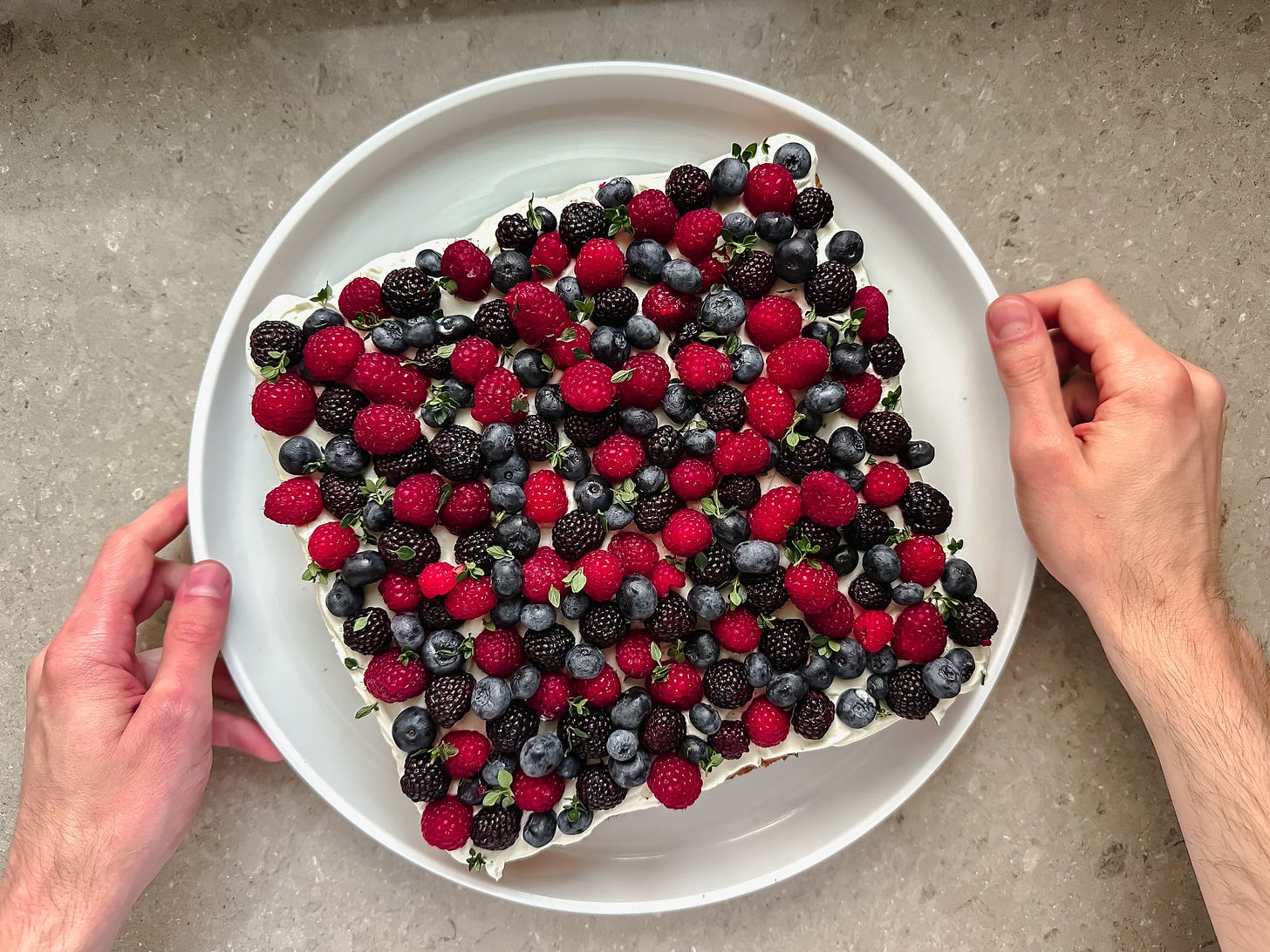 Just before serving, assemble the cake. Dump all of the Frosting onto the cake and use an offset spatula to spread the frosting evenly around the cake. Wash and dry the berries (yes, dry them). Put them on top of the frosting, and be generous. I like to to finish mine off with some sprigs of lemon thyme or even a dusting of finely grated lemon zest.