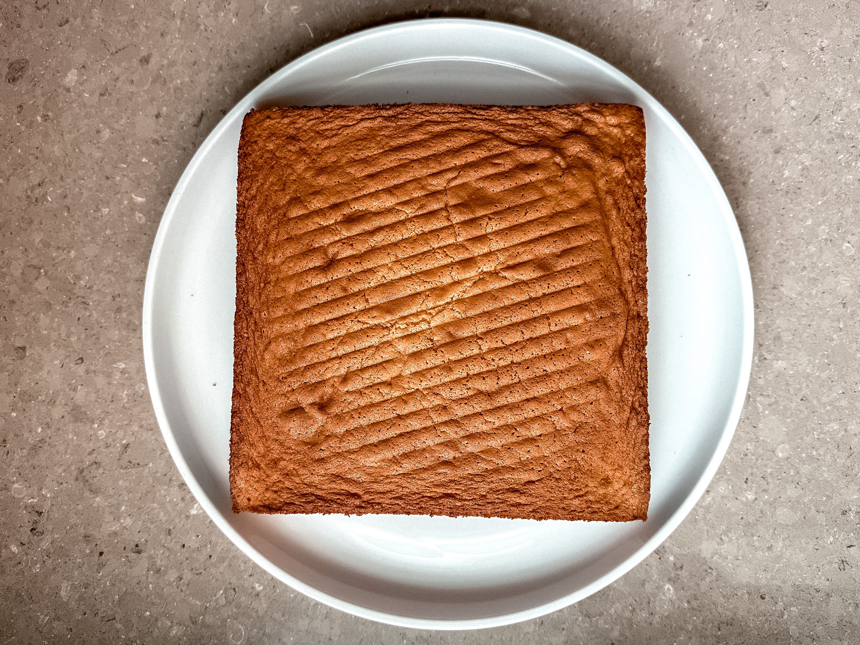 Scrape the batter into the prepared baking pan and smooth it into an even layer. Bake the cake at 350F for about 32-38 minutes (mine takes exactly 36 minutes), until the cake springs back when pressed in the middle and a cake tester comes out with just some fluffy crumbs attached (no wet batter). It will be a deep golden brown and it may have risen and domed a lot. Remove the cake from the oven, hold it 5 inches above your counter and drop it onto the counter. (Thud.) Now set the cake on a wire rack and let it cool in the pan for about 15 minutes. (The top will sink a bit and the cake will be more or less flat, which we want.) Run an offset spatula around the edges of the pan to loosen the cake. Invert the cake onto a wire rack, remove the parchment and let it cool completely on the rack (I just leave it upside down). Handle the cake gently, because this cake is quite light and fragile. After it's cool, carefully transfer the cake to its final destination. (A platter or something like that.)